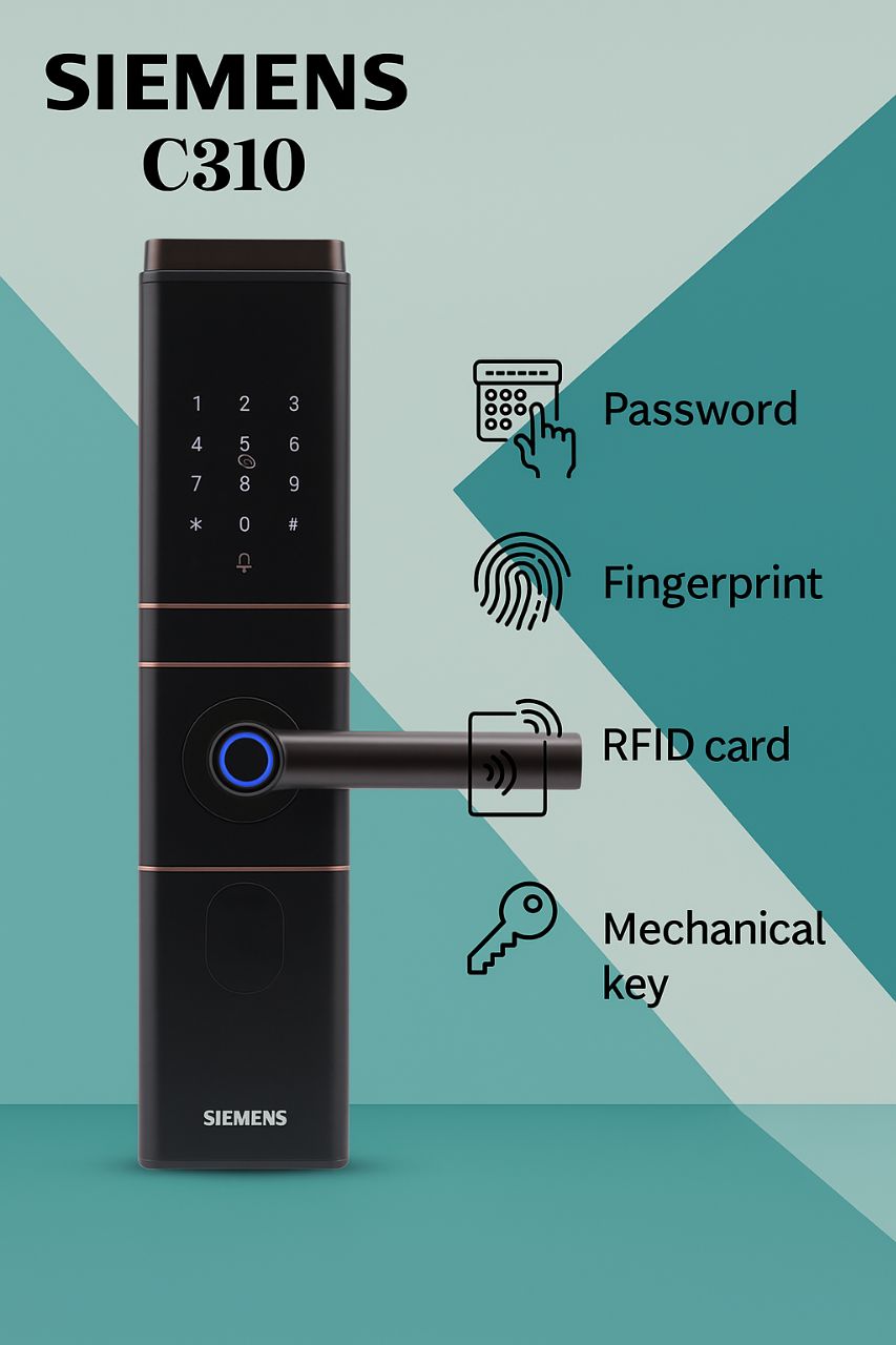 The C310 Siemens Digital Door Lock is a next-generation smart lock designed to combine Siemens’ engineering quality with modern security needs. Moreover, it blends advanced encryption, flexible access methods, and sleek aesthetics, making it the perfect choice for homeowners, landlords, and business owners who want to protect their property with style.